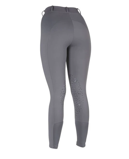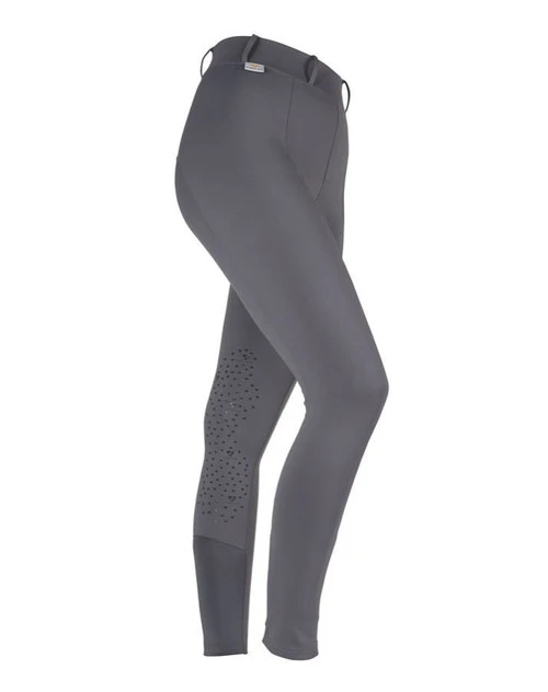 Women’s equestrian tights combine technical fitness apparel fabric with silicone knee patches for good saddle grip. The euro seat seam and higher rise are designed for flattery. Breathable and lightweight Jenner Riding Tights in Grey or Black are from the Aubrion collection at Shires Equestrian.