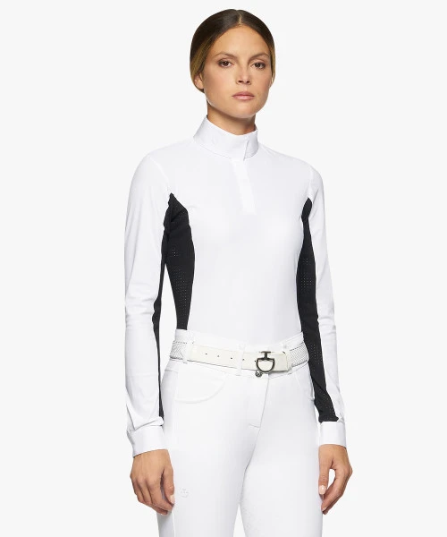 Cavalleria Toscana Jersey Perforated Insert Long Sleeve Shirt is a silky stretch jersey show shirt with sophisticated style. Women’s long sleeve white show shirt has contrast color perforated inserts on the sides and inner sleeves for cooling and distinctive style. Technical jersey offers perfect flexibility for riding. The clean covered placket and straight edge wrap collar with tonal CT embroidery gives the Perforated Insert Hunter Polo a correct look for hunter jumper competition.