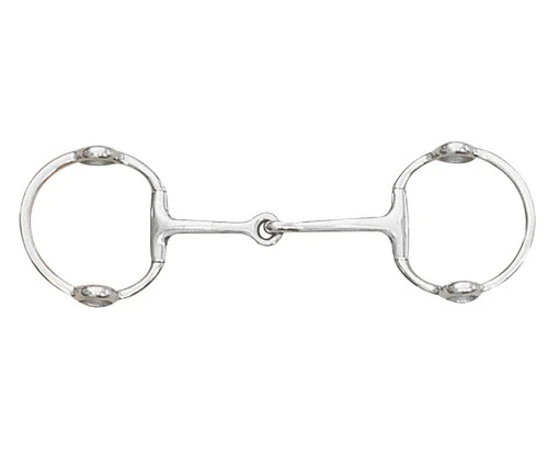 Made by Centaur, the stainless steel Cheltenham eggbutt gag bit features a single jointed snaffle mouth with eggbutt cheeks. The cheek rings have openings designed to accommodate leather or rope gag cheeks. The Cheltenham Gag Metalab stainless steel bit is available in sizes 5 and 5 1/2.
