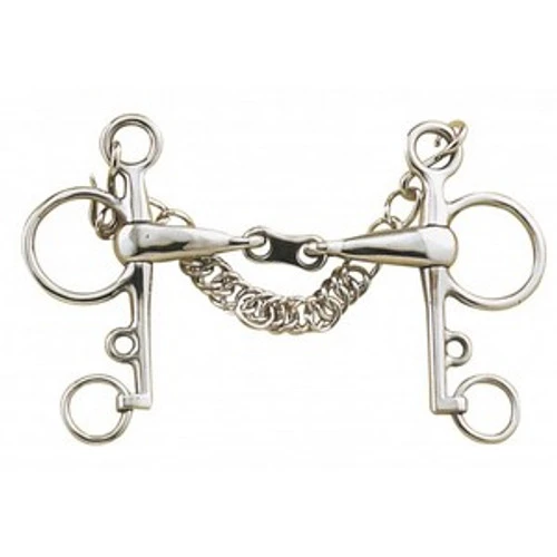 The French Link Pelham bit is a jointed snaffle with French link center for additional tongue pressure when needed. This Centaur Pelham with French link has 5 inch cheeks and is made with Metalab stainless steel. Sizes: 5, 5.5.