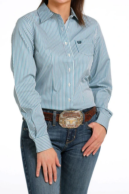 Ladies Cinch Tencel Mint Stripe Long Sleeve Shirt is a classic button front style with cool, soft performance fabric. The Tencel blend feels fabulous and is moisture wicking, quick drying, and wrinkle resistant. With longer sleeves and shirt tail, the Cinch Tencel Mint Stripe Shirt is ideal for Western showing and daily riding.