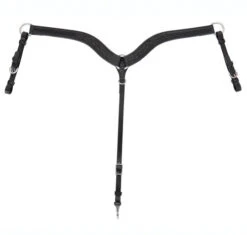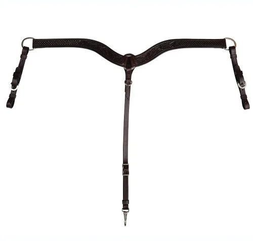 Monarch/Wind River Breast Collar from Circle Y is heavy duty doubled and stitched leather with finished edges and stainless steel hardware. It’s 1.75″ wide and tapered for a comfortable fit. There is soft fleece under the center ring. Great looking and substantial western breast collar from Circle Y fits most horses. Handsome western tack has classic leaf hand tooling and is available in 3 shades.