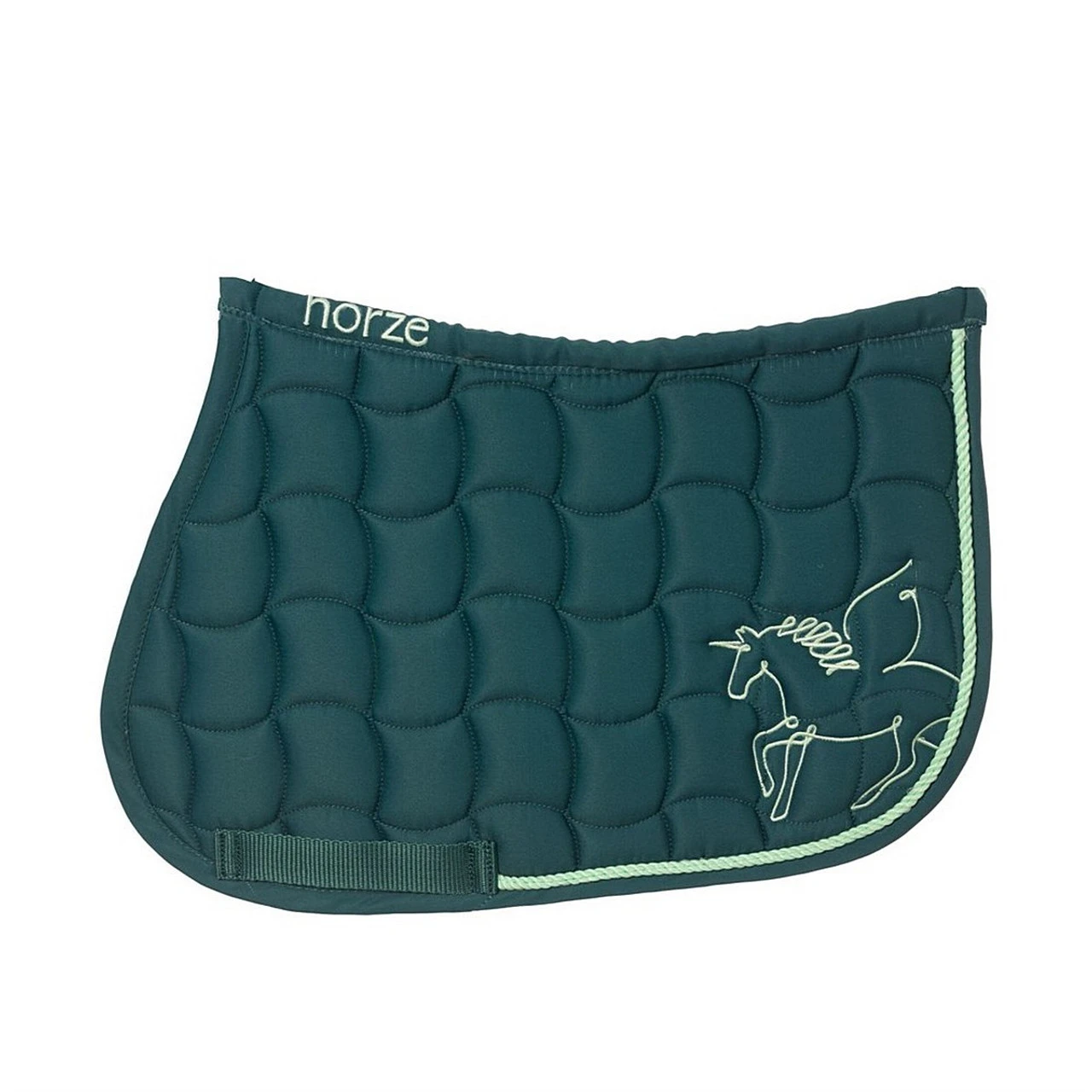 Horze Pegasus Pony Saddle Pad ensures a great fit with the contoured spine and webbed girth loops. The light poly padding and polyester construction are wicking and quick drying. Handsome Caviar and Deep Sea Green colors have charming Pegasus embroidery and coordinating trim to give a nice finished look.