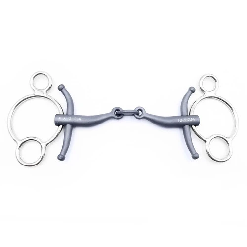 The Fager Carl Titanium Universal features the Carl mouthpiece with innovative Baby Fulmer Universal cheeks. This combination creates an effective bit for horses that might need a little extra control because they pull or lean but it won’t cause undue tongue pressure. The two ring gag cheek lets you decide the leverage you want to use.