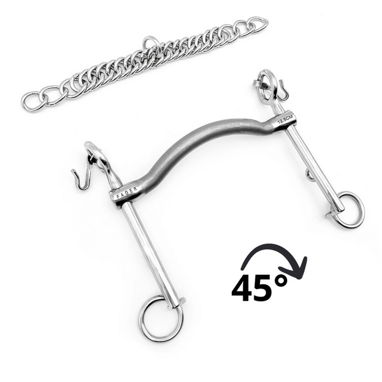 Fager Charles Weymouth dressage bit works well for horses with a large, fleshy tongue, those that pull, and ones requiring more freedom to maintain a consistent connection. This mouthpieces gives tongue relief with smooth pressure divided evenly over the mouth for more consistent contact. The Sweet Iron is used to encourage the horse to accept the bit and carry it correctly in the mouth.