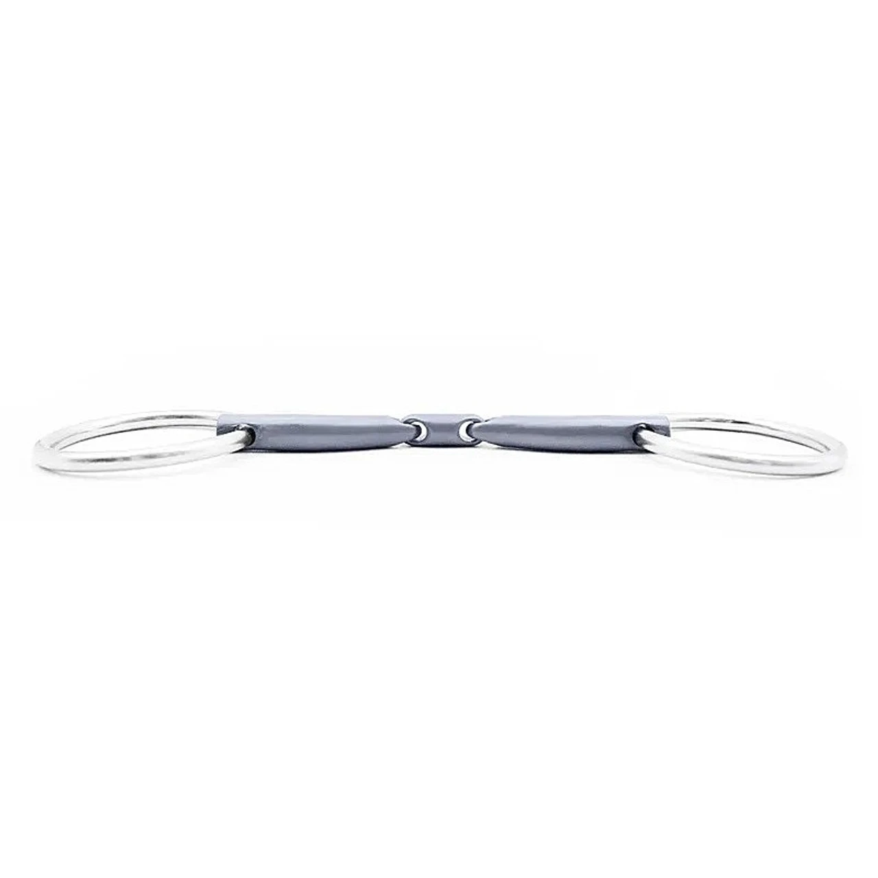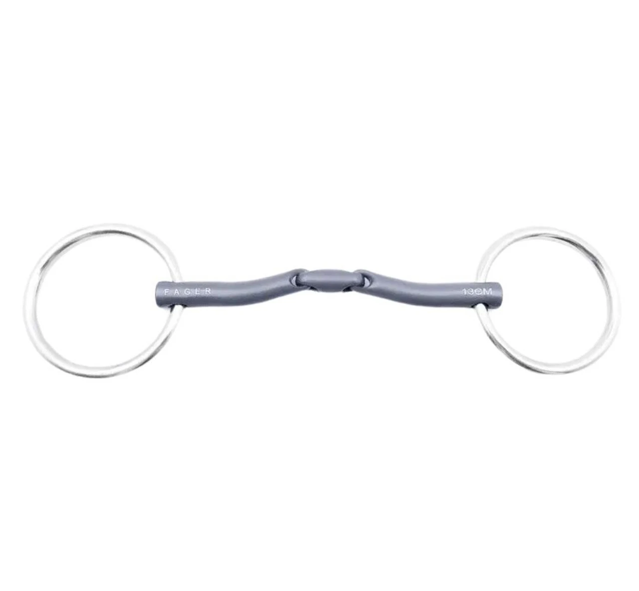 Fager Mary Titanium Loose Ring Bradoon has a double jointed mouthpiece that distributes pressure and fits naturally across the tongue. The Mary mouthpiece offers balance, comfort, and a quicker response to cues. Fager’s Anoblast technique ensures the bit is extremely durable, has no metal taste, and gives the titanium its distinctive matte grey color. Anoblast can only be used on medical grade titanium. Lightweight titanium bit from Fager is antibacterial, non-toxic, hypoallergenic, and warmer than steel.