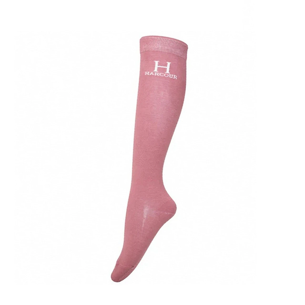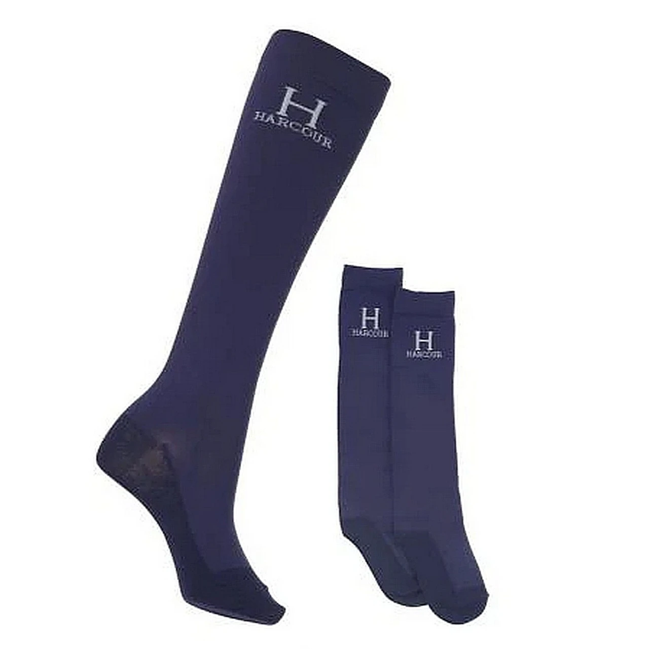 These comfortable equestrian socks are thin and breathable in smooth polyester and cotton with a cotton reinforced foot. The knit has an eleant sheen in the sunlight and features the Harcour logo in white just below the wide cuff. Harcour Badminton Rider Socks are sold in a set that includes two (2) pair of socks in the same color.