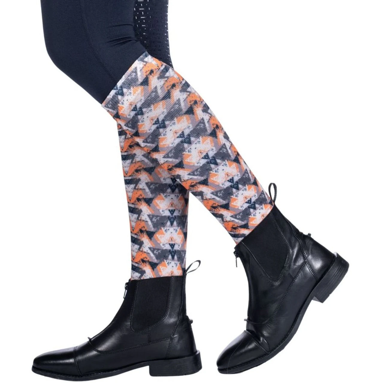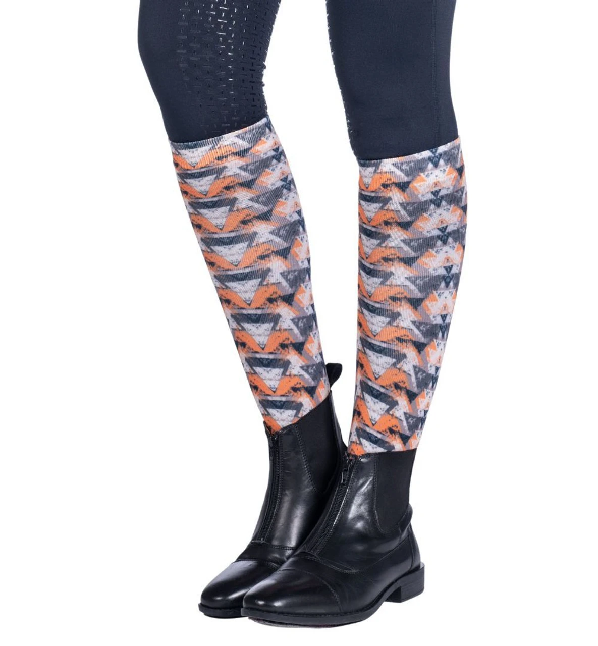 Women’s HKM Lyon Active Riding Socks are tall boot socks with a fun, modern graphic print in shades of orange and olive. These equestrian socks have just the right thickness to feel close and comfortable under your riding boots.