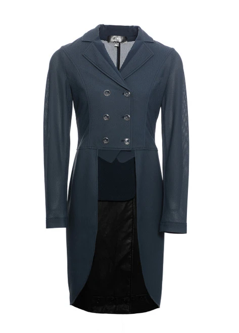 The body of the MotionLite Shadbelly is unlined yet has a structured look. The nylon/Spandex blend provides excellent stretch and won’t pull at the shoulders or bind at the elbows. The hidden zipper underneath the front buttons assures you a neat, gap-free appearance. Mesh nylon has a knitted texture for depth and interest as well as airflow. The tails are lined in a leather-look polyurethane and have removable tail-weights. Extra touches include an Alessandro Albanese lapel pin and exchangeable buttons. The AA Platinum MotionLite Shadbelly is the perfect dressage coat for the warm summer showing months to give you centerline style and total comfort.