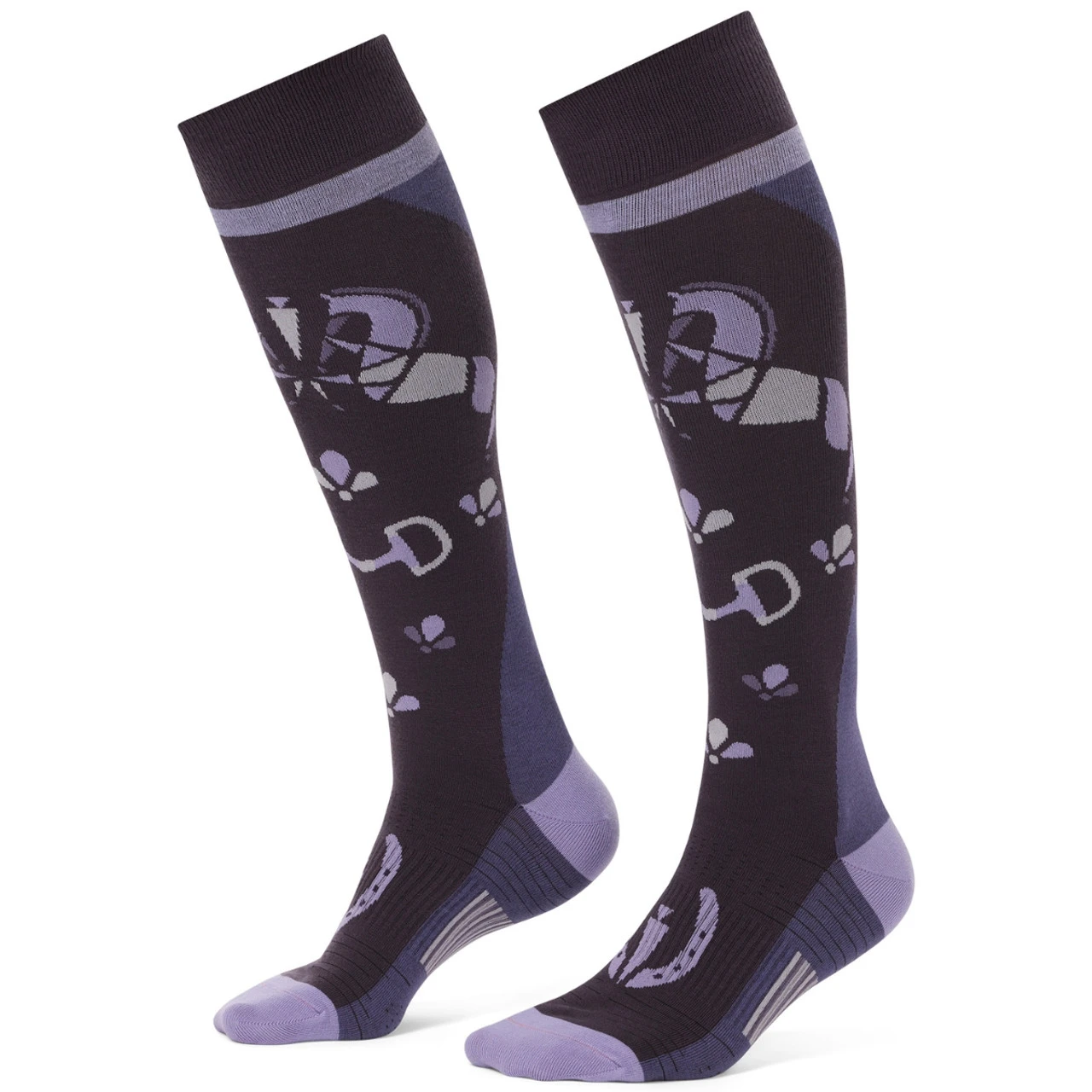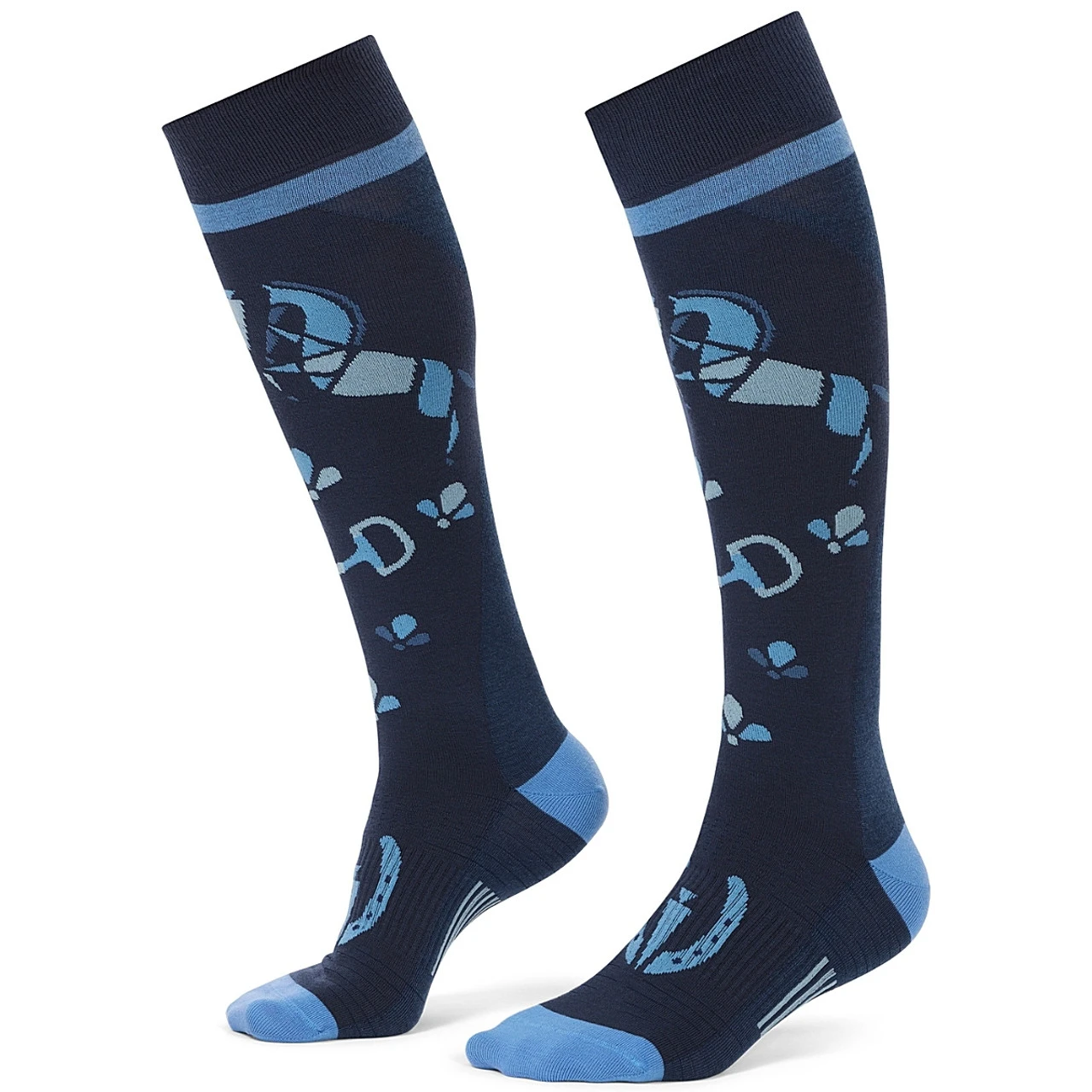 Women’s Kerrits Happy Horse Knee-Hi Wool Socks have a stylish pattern of horse, flowers, bit, Kerrits logo, and stripes in seasonal Kerrits colors. Mid-Foot Compression offers support at the arch to reduce fatigue. These socks are perfect for riders in any discipline and are cozy with rainboots, too. Mary’s has the new Kerrits Happy Horse Wool Socks in Plum Noir, Black, and Galaxy Blue.