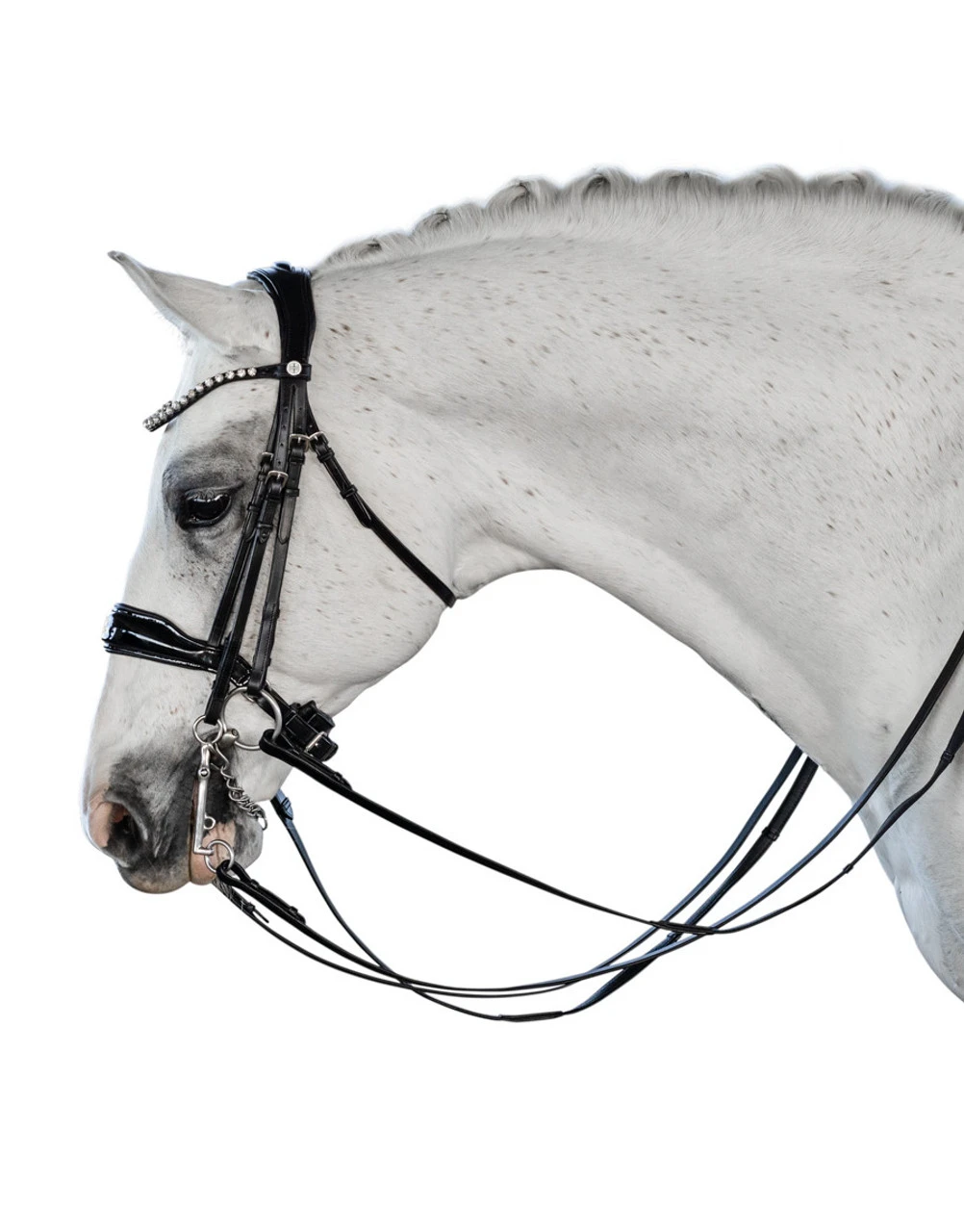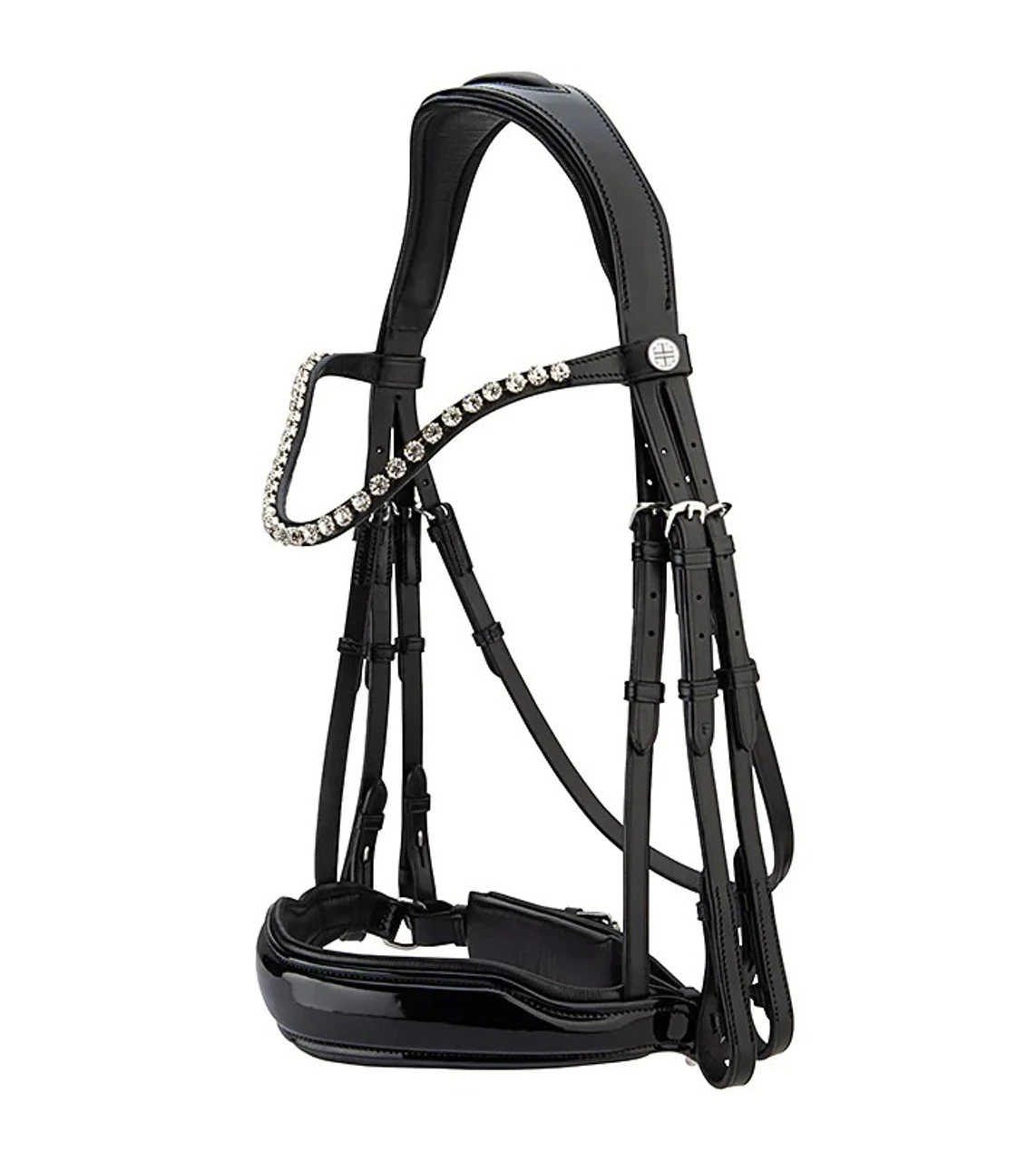 Lara Tweedie Glam Double Bridle will let you shine down the centerline with its patent leather Glam Noseband and gorgeous big crystal wave browband. Sophisticated and luxurious, this impressive dressage competition bridle is also meticulously designed for comfort and performance. Lara Tweedie is a dressage competitor and equine veterinarian who creates dressage bridles with a strong focus on horse comfort and aesthetics. The LT Glam Double Bridle is proof!