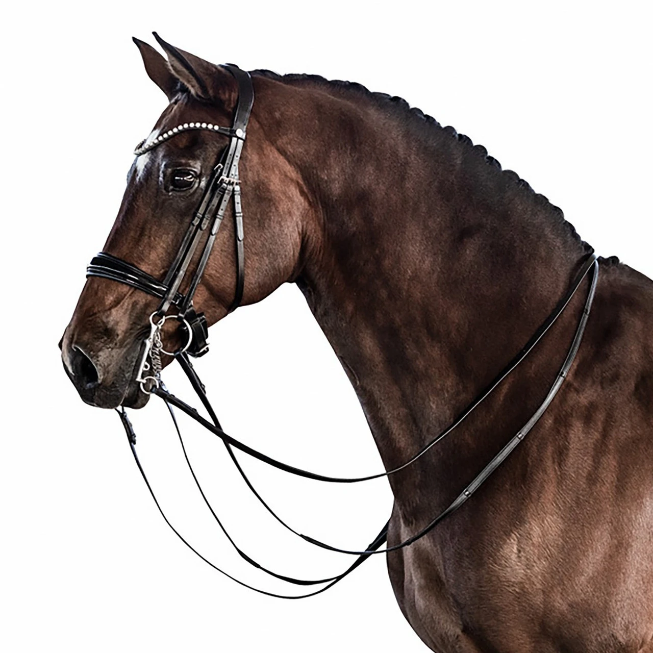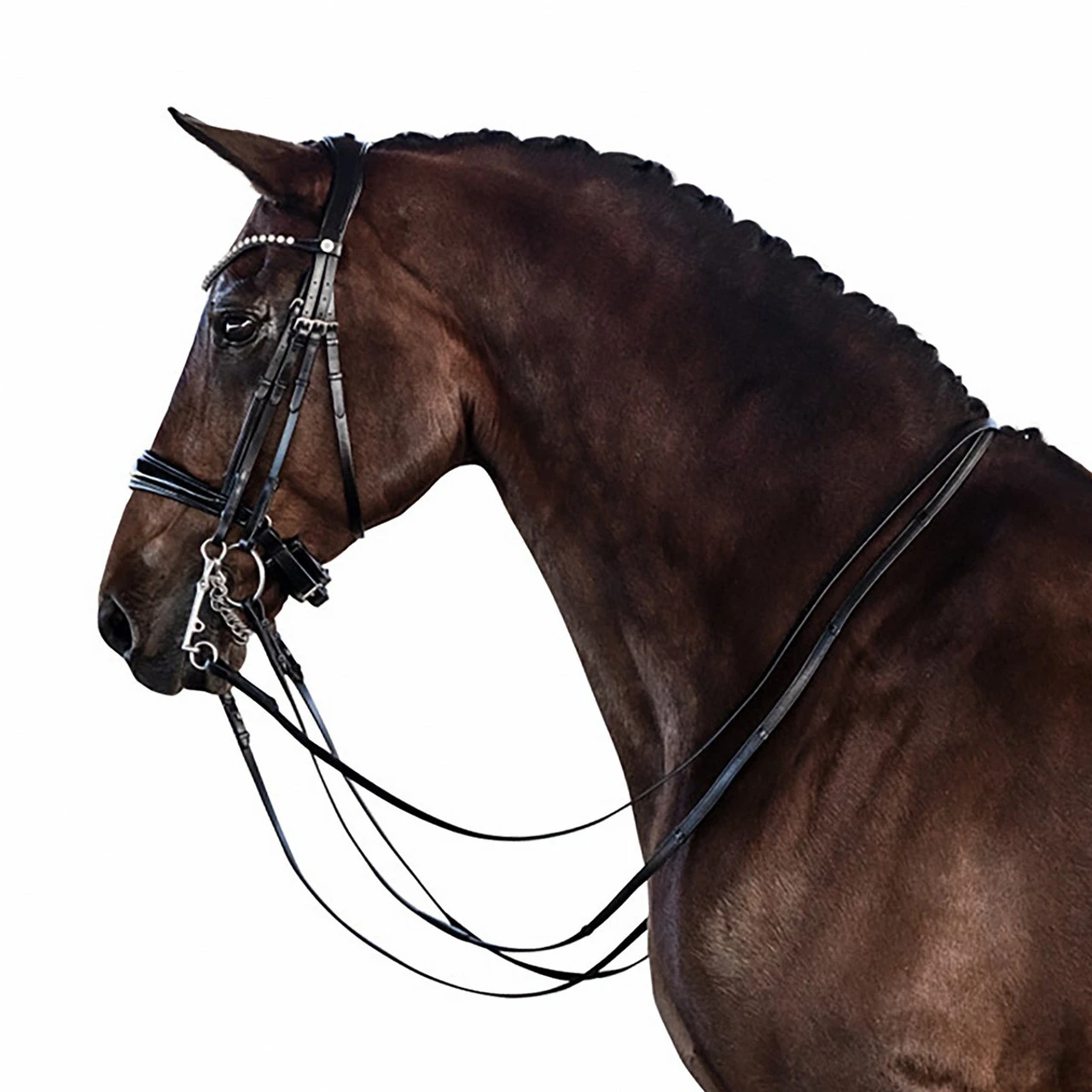 Lara Tweedie Patent Essential Double Bridle has a classic, elegant look highlighted by a patent leather noseband and gorgeous large crystal browband. The Essential Double Bridle boasts an ergonomic fit, anatomically configured crown piece, and tremendous attention to detail. This dressage Weymouth bridle is comfortable for the horse while looking polished and professional.