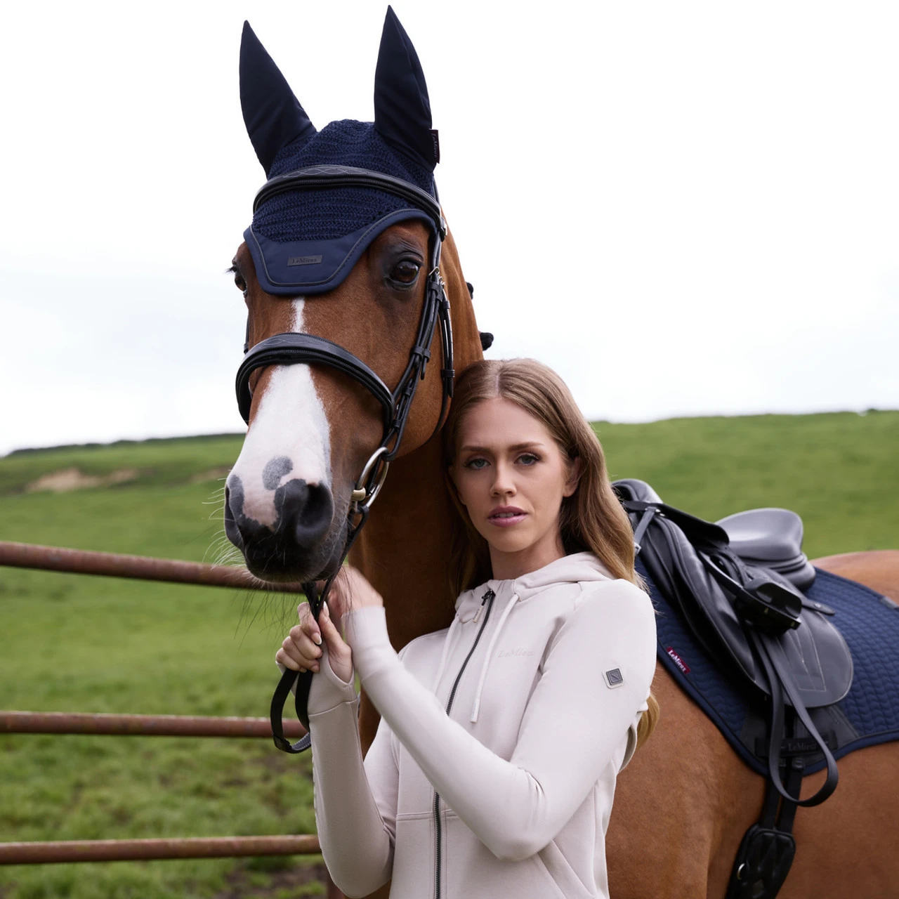 LeMieux Essence Acoustic Ear Bonnet decreases sharp sounds to improve your horse’s relaxation and concentration. A dense soundproof layer is paired with a bamboo lining and acoustic Lycra covering for peak performance. The ear net is hand crocheted in a special patterned knit. The profile is clean and sporty and coordinates perfectly with the Essence Dressage and Close Contact saddle pads. LeMieux Essence Acoustic Ear Bonnets in Spring 2025 colors Rosewood, Stone, and Navy are finished with a softshell front panel and subtle matte silicone LeMieux tag.