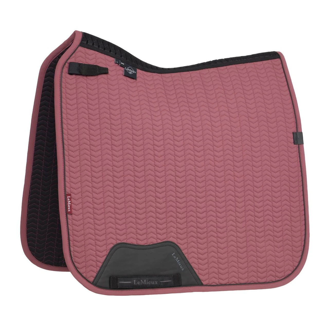 LeMieux Essence Dressage Square Pad in new 2025 Navy, Stone, and Rosewood colors has a sleek, smooth look and integrated performance features. The contour quilted softshell top layer is backed with a self-cooling lining that wicks sweat and regulates temperature. Essence Dressage Square Pad gives your horse even more comfort with the anatomic shape that relieves pressure.