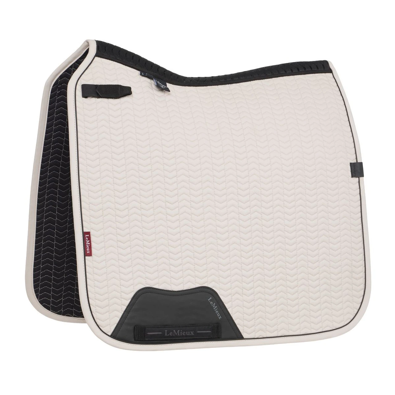 LeMieux Essence Dressage Saddle Pad has a friction-free binding plus 3D carbon mesh spine to enhance airflow. The high wither design with good spinal clearance helps achieve the best saddle fit. Elasticated D-ring straps, a PU girth protection area, and girth loops create a secure fit. LeMieux Essence Dressage Square Pad combines a polished style, practical function, and outstanding comfort for horses.