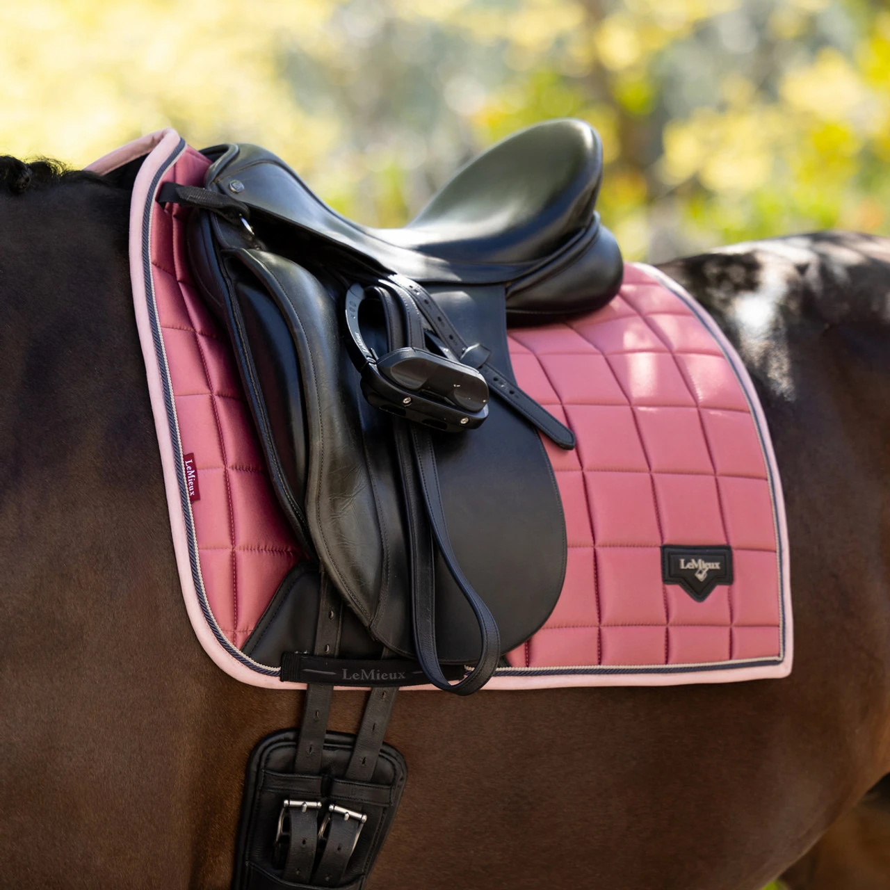 New LeMieux Loire Classic Dressage Square Pad is here in Spring/Summer 2025 LeMieux colors Dusk, Peony, and Aqua. The luxurious Woven Satin dressage pad has a square edge in back and a beautiful sheen that enhances the colors. Elegant yet practical, the LeMieux Loire square quilted dressage pad is a great choice for everyday performance or showing.