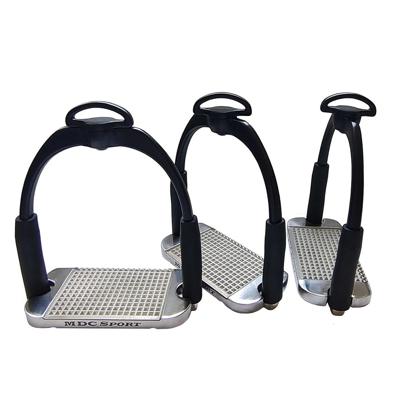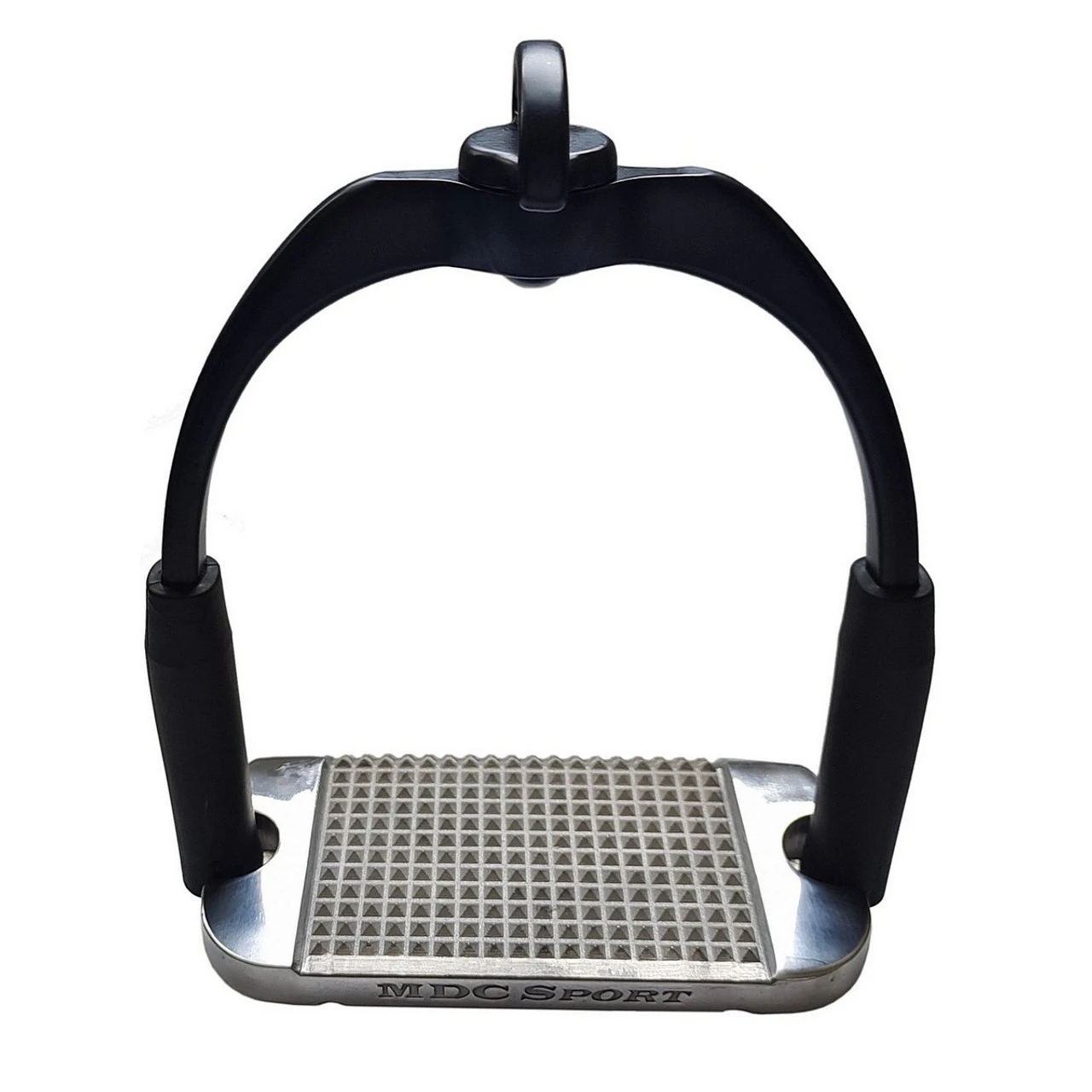 MDC Black Super Sport Stirrup is based on the MDC Black Ultimate Stirrup and offers upgraded performance and comfort. The new Black Super Sport has a high traction, low profile wide aluminum tread. The tread provides more traction, improved base of support, and comfort in a wider format that is thinner than standard fillis irons.