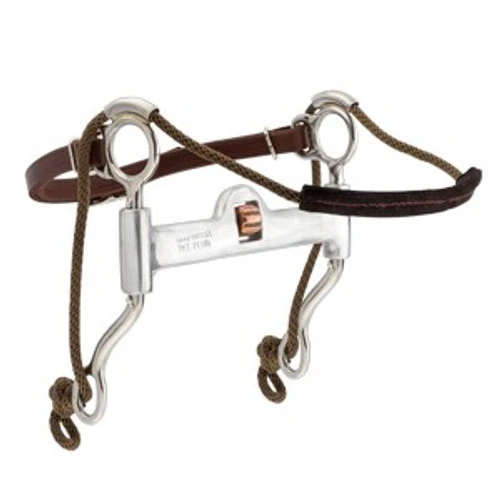 Mikmar Feather Bit with Straight-Solid mouthpiece has the Mikmar 4-point pressure style in a more streamlined look for competition. The Feather Bit from Mikmar is appropriate for western shows and competitions, as well as trail riding. This slimmer, straight mouthpiece bit has swiveling shanks and a leather wrapped rope for the nose, which can be removed for showing. The straight mouthpiece with copper roller gives a more solid feel and offers mild leverage. This versatile western bit disperses pressure to achieve comfortable collection, proper head carriage, and control. The horse is discouraged from evading the bit, making it a nice choice for young horses that are transitioning to mild leverage as well as a horse with a good mouth who could use more framing and relaxation.