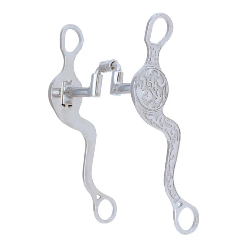 The Myler Embossed Seven Shank Bit with MB27PB Correctional Medium Ported Barrel mouth offers quick and efficient control with a narrow port that still allows comfortable room for the horse’s tongue. The stainless steel 7 1/2 inch Embossed Seven Shank gives moderate leverage plus classic good looks with its floral pattern and concho. The Myler Bits MB 27PB Medium Ported Barrel mouthpiece in polished sweet iron is a Level 2-3 bit.