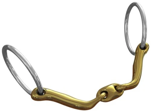 The Neue Schule Verbindend Bradoon helps the rider with a dressage horse that is heavy on the forehand. The rider’s signals through the rein are emphasized and therefore clearer. The uniquely shaped Verbindend mouthpiece has a channel for the tongue, preventing evasions, stiffening, and tension in the jaw. Helpful for developing the bend needed for lateral work and tighter turns.
