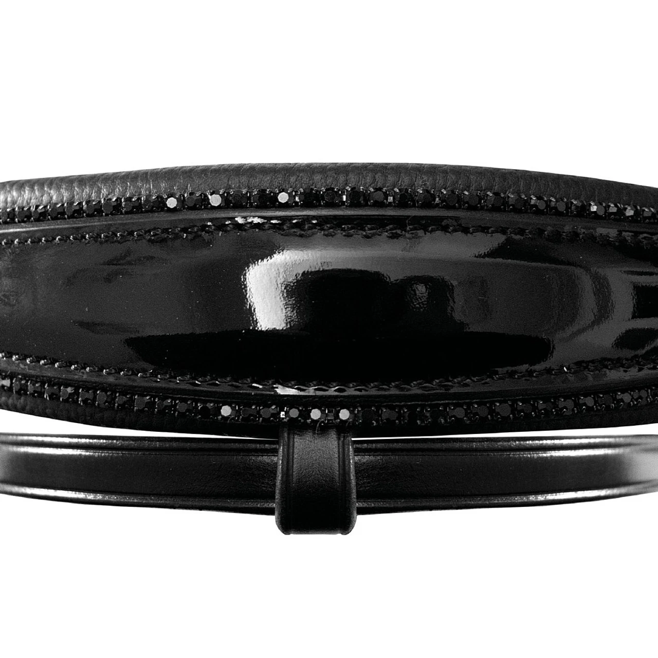 The Passier Shadow Snaffle Bridle has an especially horse-friendly design plus shiny patent leather and sparkling Graphite Premium Crystals. The dressage snaffle bridle features an anatomically shaped padded crown with extra soft padding on the sensitive ear cartilage. Passier Shadow Snaffle Bridle with flash strap has a refined look with just the right amount of glamorous trim.