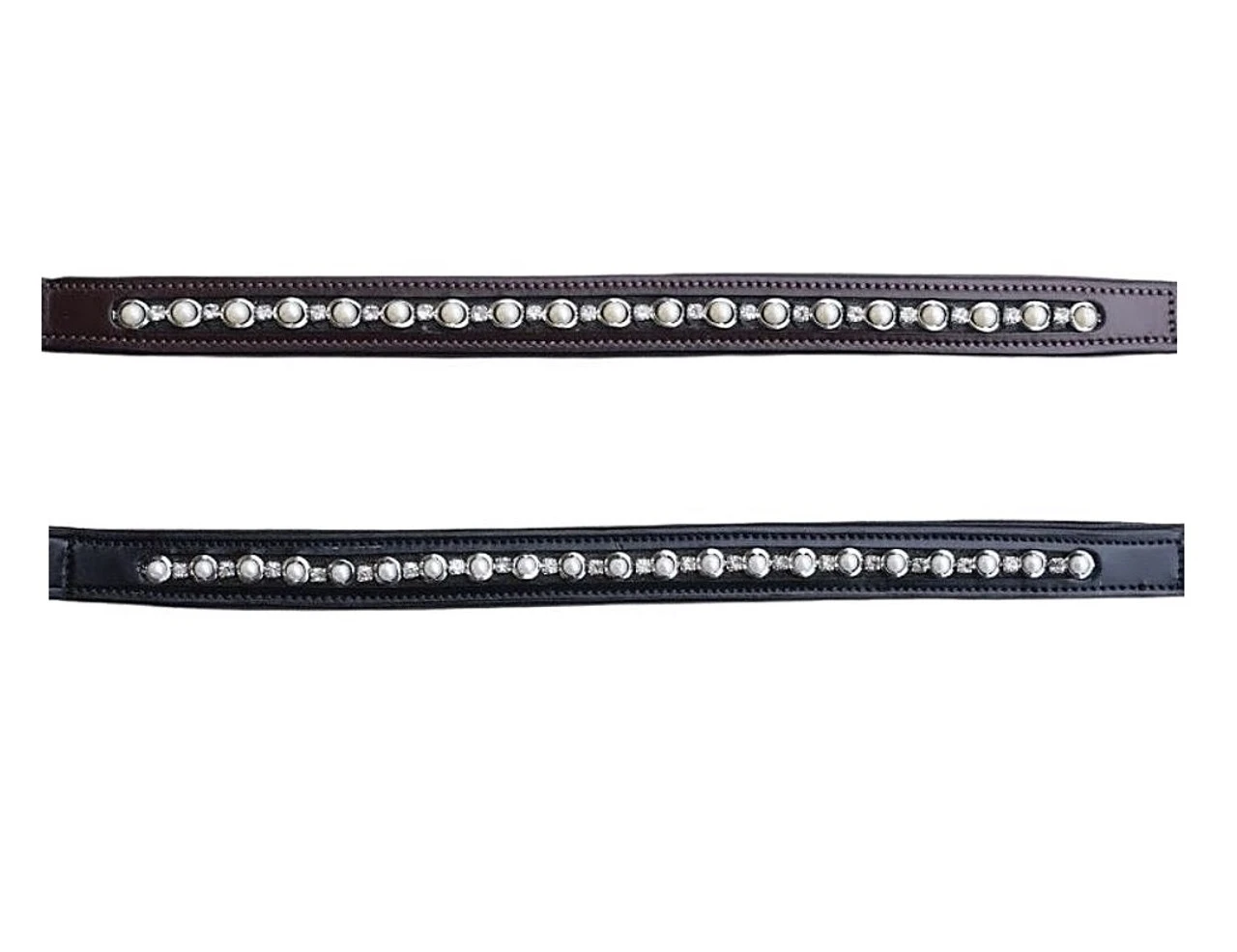 Red Barn Pearl & Crystal Browband has a row of alternating clear crystals and creamy faux pearls set in silver. The inset row of gems on black or brown leather has a classic, sophisticated look that is lovely for competition, clinics, or everyday elegance.
