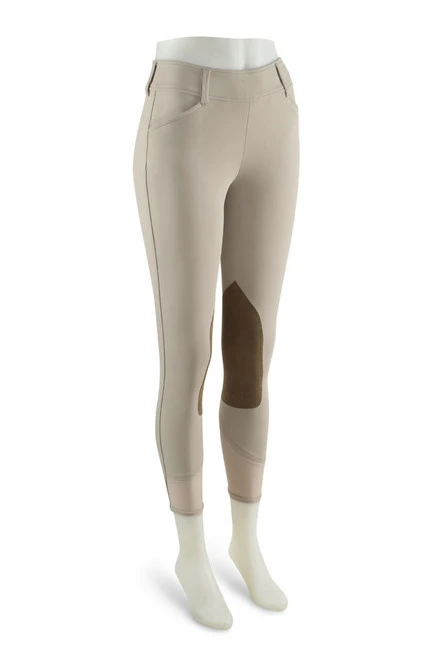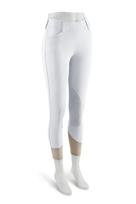 Stretch mesh lower leg panel allows a bulk-free fit under your tall boots or half chaps. Features a wide modern waistband and belt loops to accommodate your favorite belts. High performance stretch fabric dries quickly to keep you comfortable and to be ready fast after laundering. Silky smooth blend of 92% nylon/8% elastic has a luxurious feel. Machine wash, hang to dry. In Sand, a light tan with brown contrast knee patches, and White.