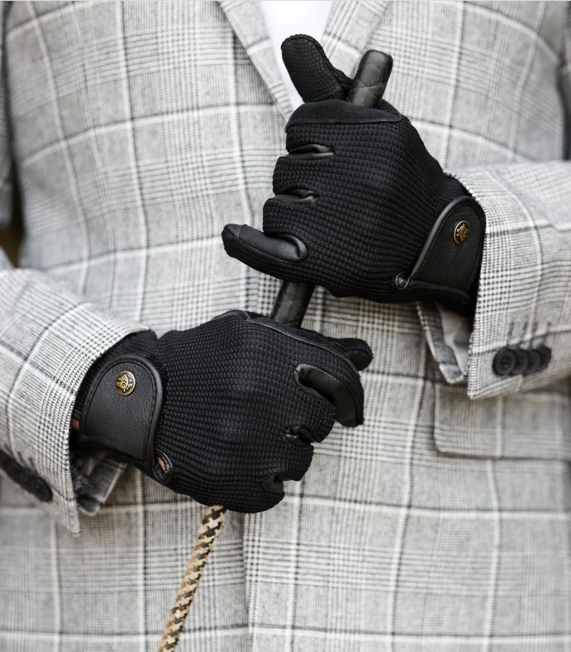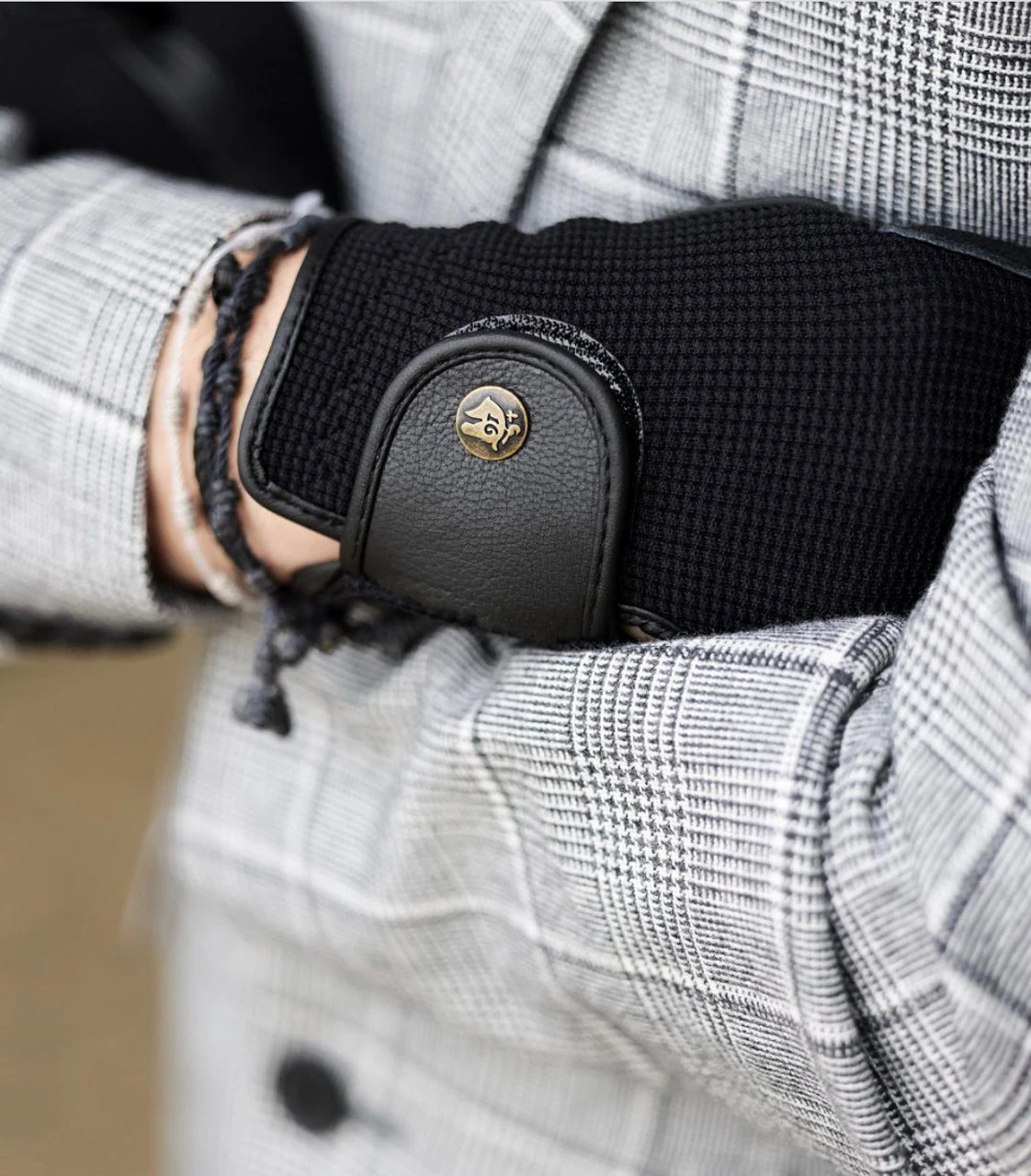 Equestrian gloves from Sixteen Cypress give riders excellent rein contact with suede reinforced grip and close-fitting leather palm. The performance stretch top is breathable and pressure-free. A digital touch patch on each index finger lets you use a touchscreen without removing the glove. The 16C Riding Gloves have an elasticated wrist and hook-and-loop closure tab finished with a brass 16C logo rivet (not the logo embroidery.)